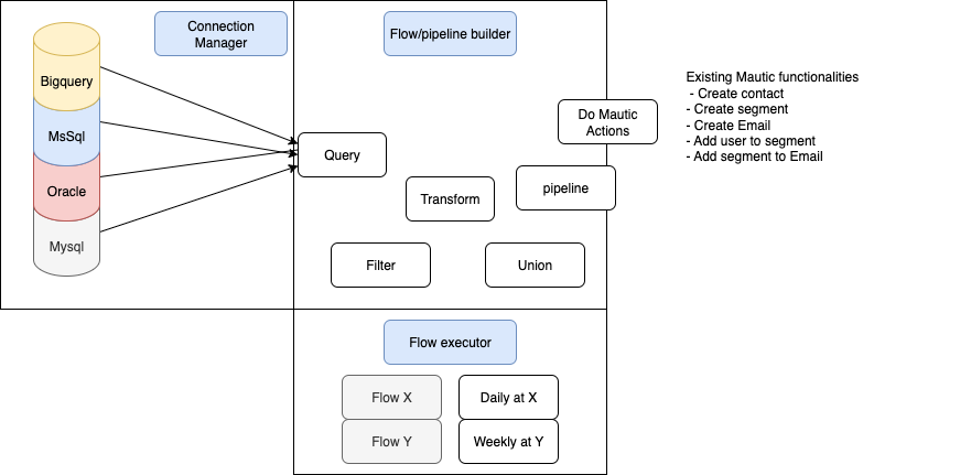 Wat they want to do is combin data from different data sources (like bigquery and OracleSQL) , do ssome transformations on them (sort/ unique / filter / join / lookup / …) and then load them into Mautic as a segment.